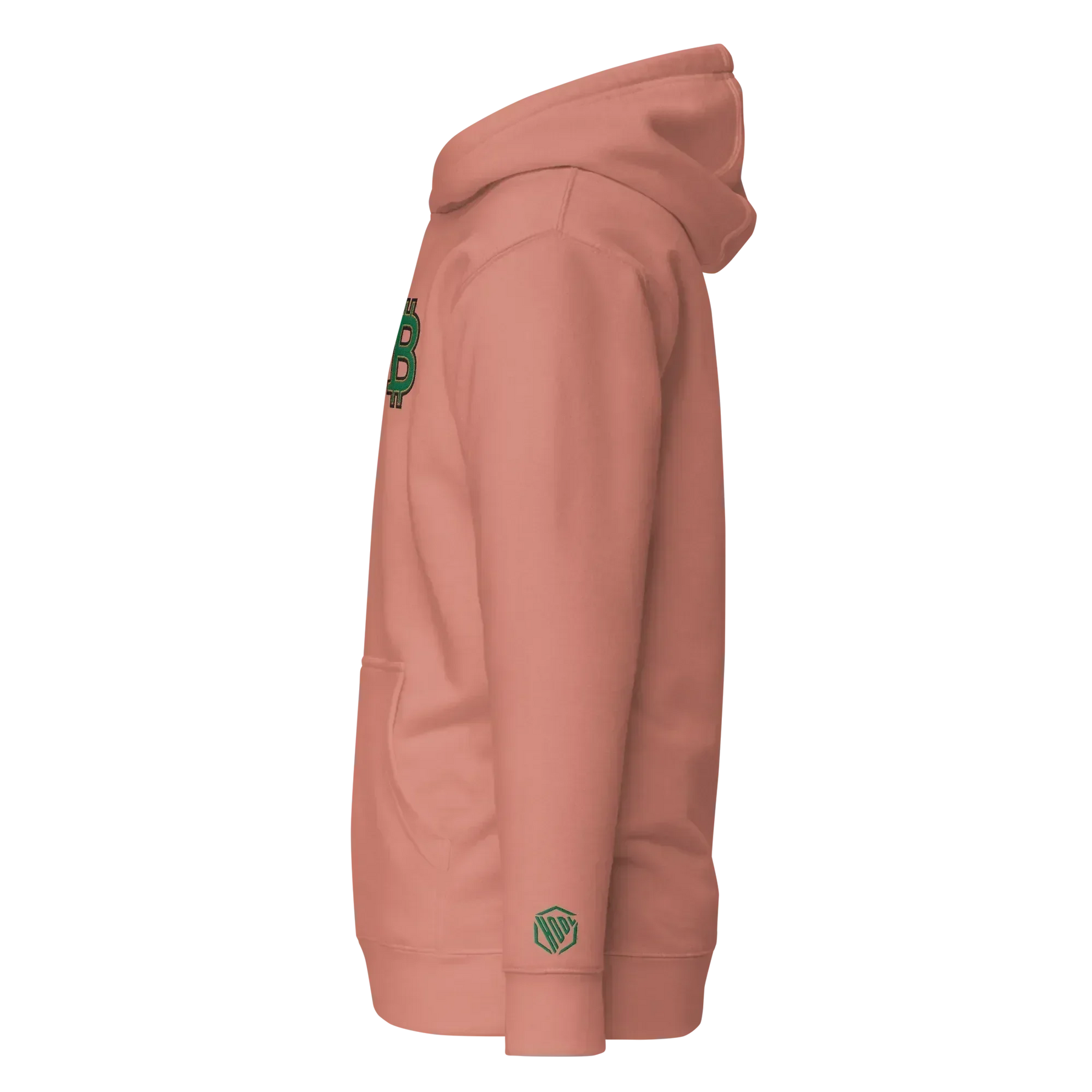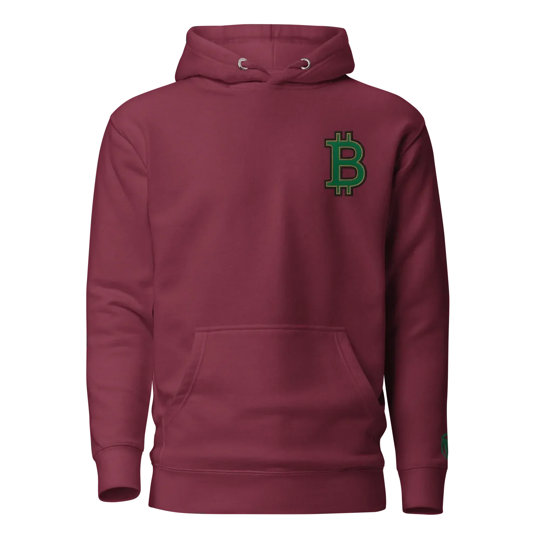 Große, hochwertige Stickerei: Das Bitcoin-B in Grün mit goldener und schwarzer Kontur verleiht dem Hoodie einen luxuriösen und unverwechselbaren Look.