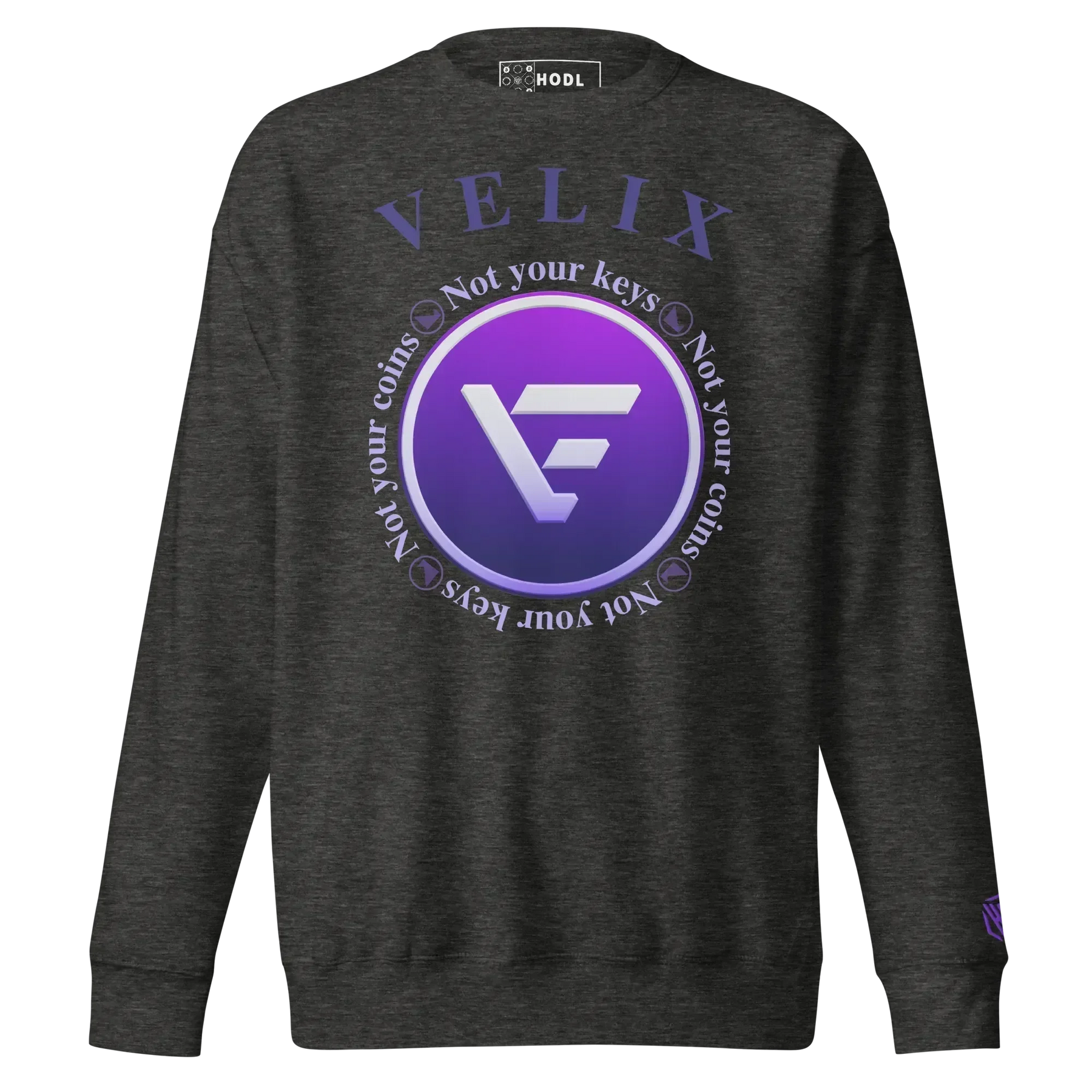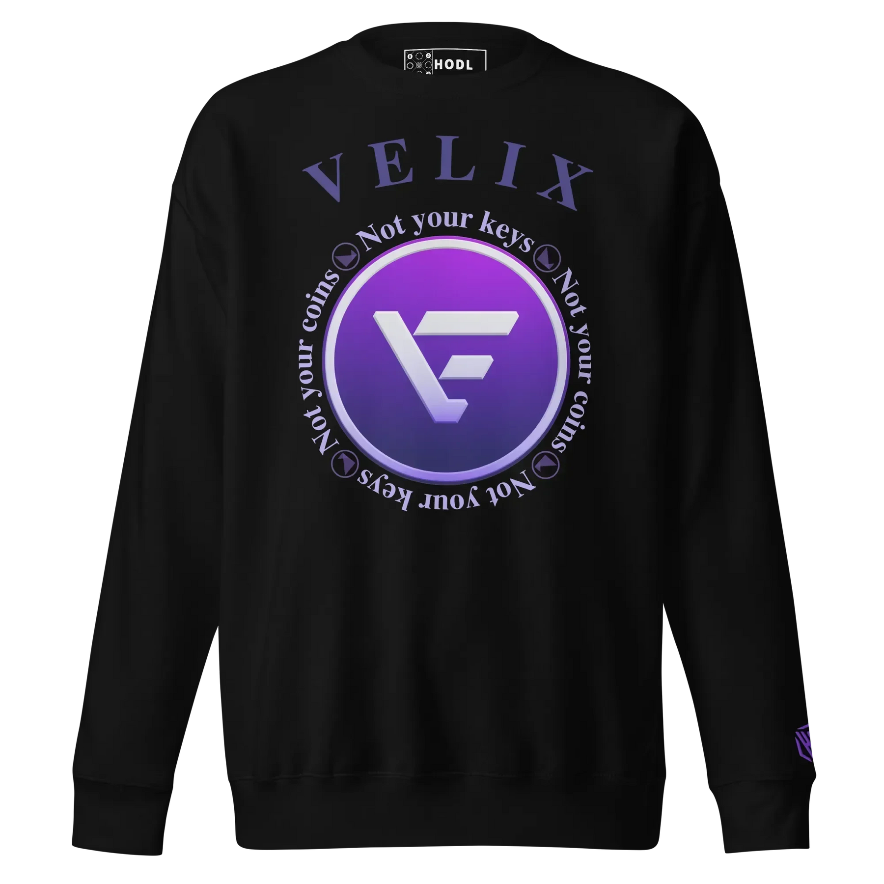 Das „Not Your Keys, Not Your Coins“-Design ist eine starke Erinnerung daran, wie wichtig Eigenverantwortung in der Kryptowelt ist. Das VELIX-Logo in leuchtendem Violett steht für Innovation und Fortschritt in der Blockchain-Technologie. Entdecke mehr über VELIX, die Klever Chain und die Vision hinter diesem einzigartigen Sweatshirt.